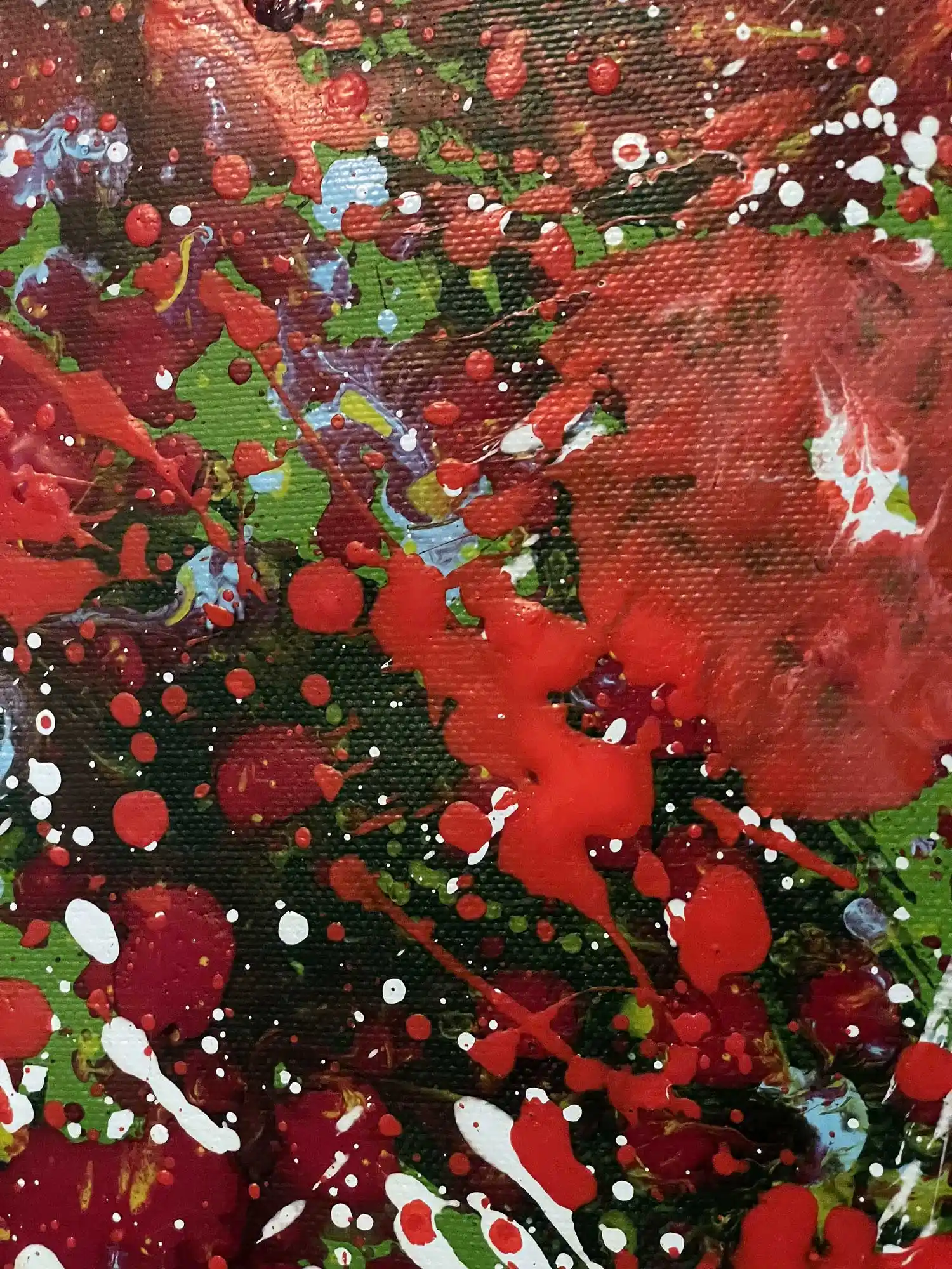 “Scarlet Shine” is created with acrylic paint, textured layers, and expressive splashes.
