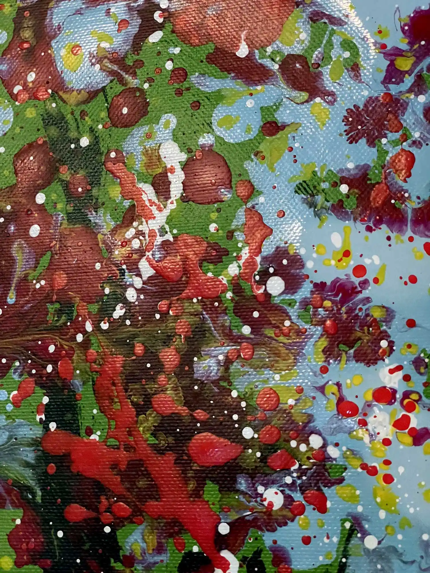 This vibrant mixed-media artwork features expressive red blossoms and layered gestures.