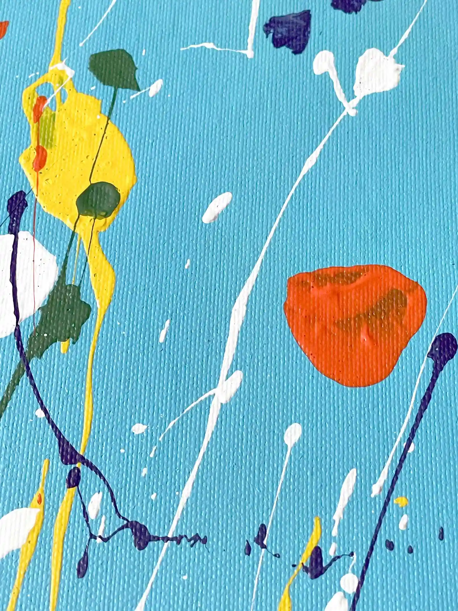 Splashes, drips and vertical movements interact across the surface, creating a sense of downward flow balanced by expansion and openness.