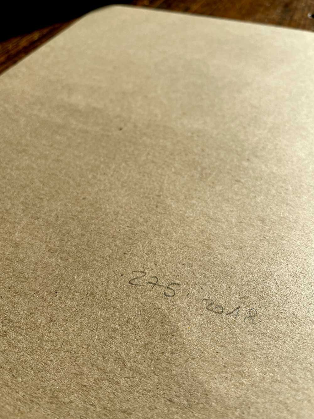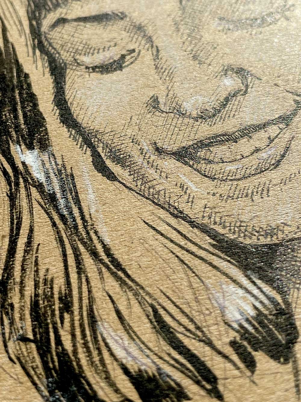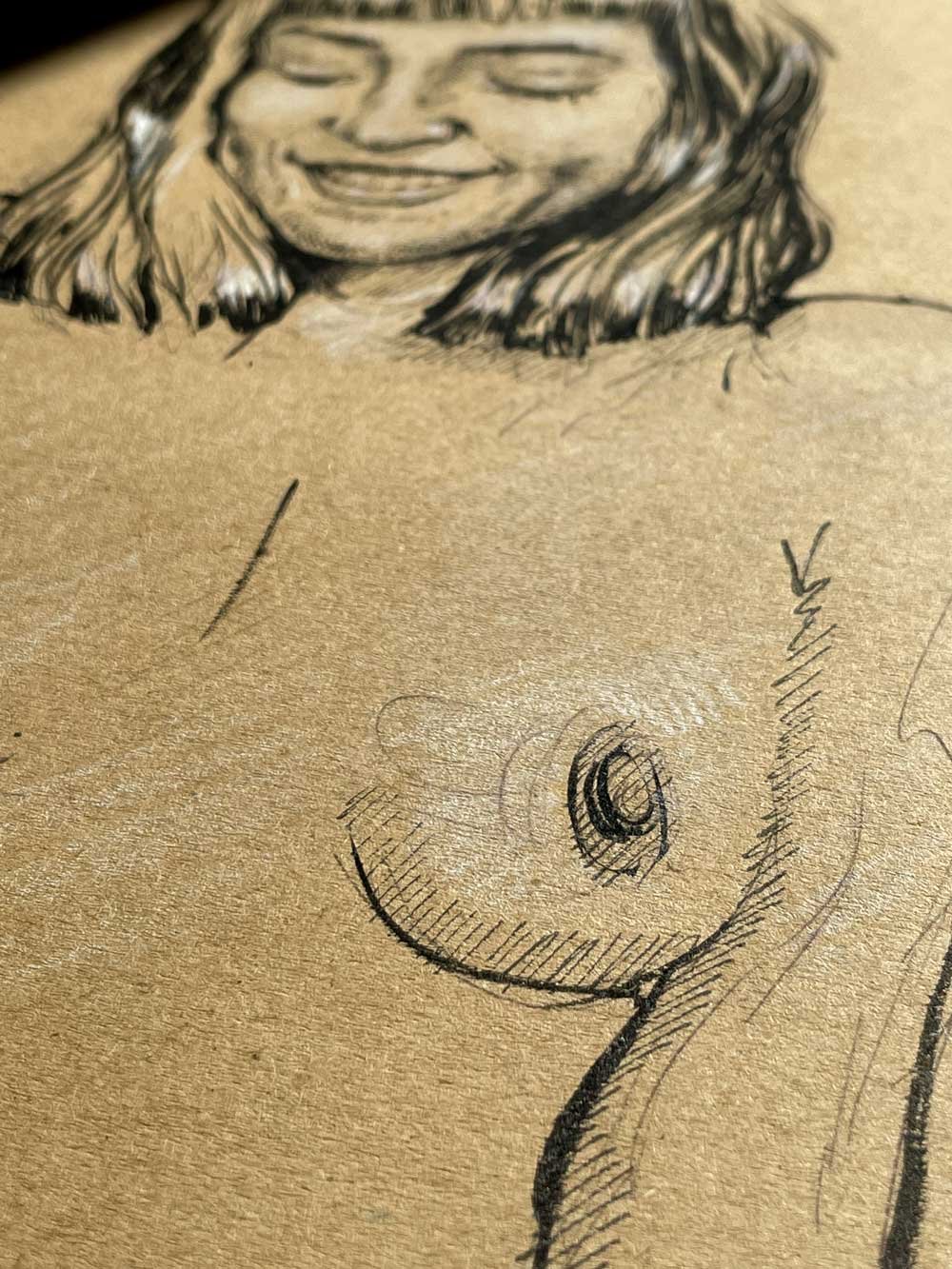 Created with black ink and white pastel on brown A4 paper, the work reveals an intimate balance between bold lines and delicate highlights.