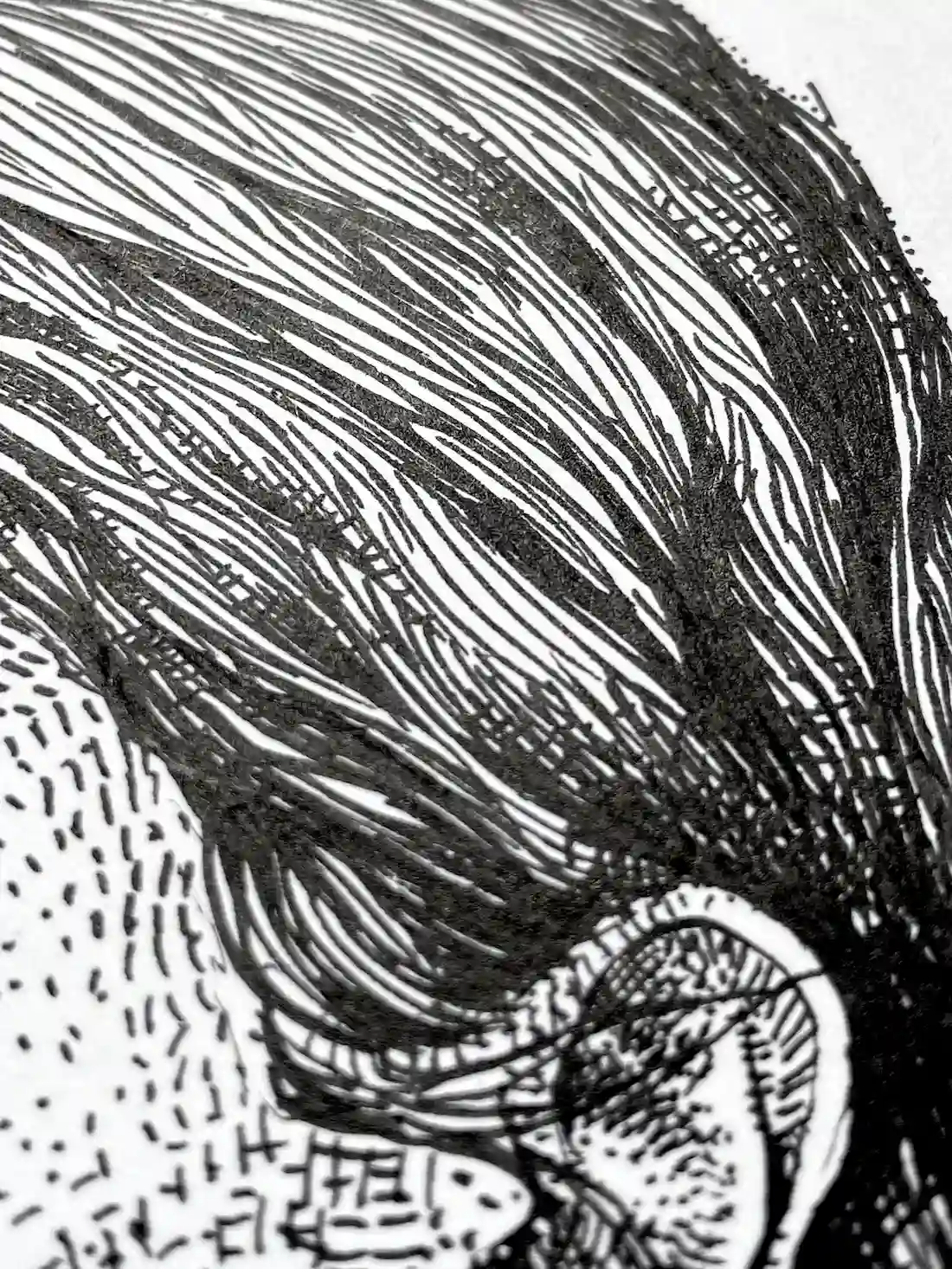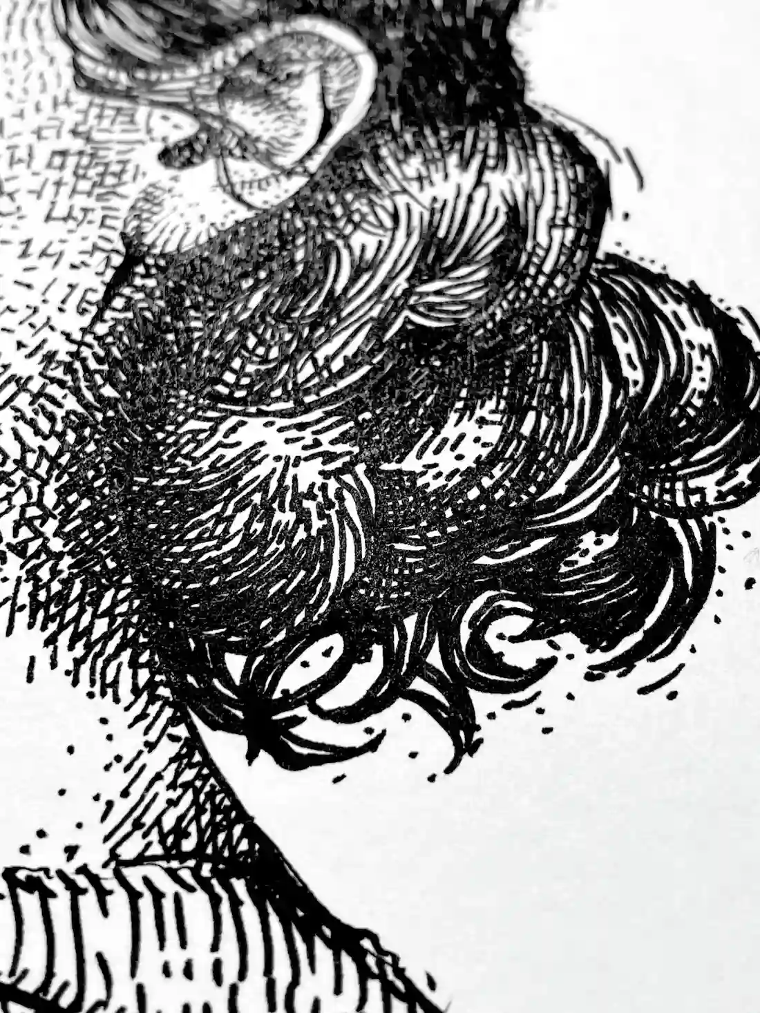 Moreover, the image builds through accumulation rather than outline. Thousands of individual marks construct the face — stippling across the cheeks and forehead, crosshatching along the jaw, neck and shoulder. As a result, the figure acquires weight and volume without a single continuous contour line.