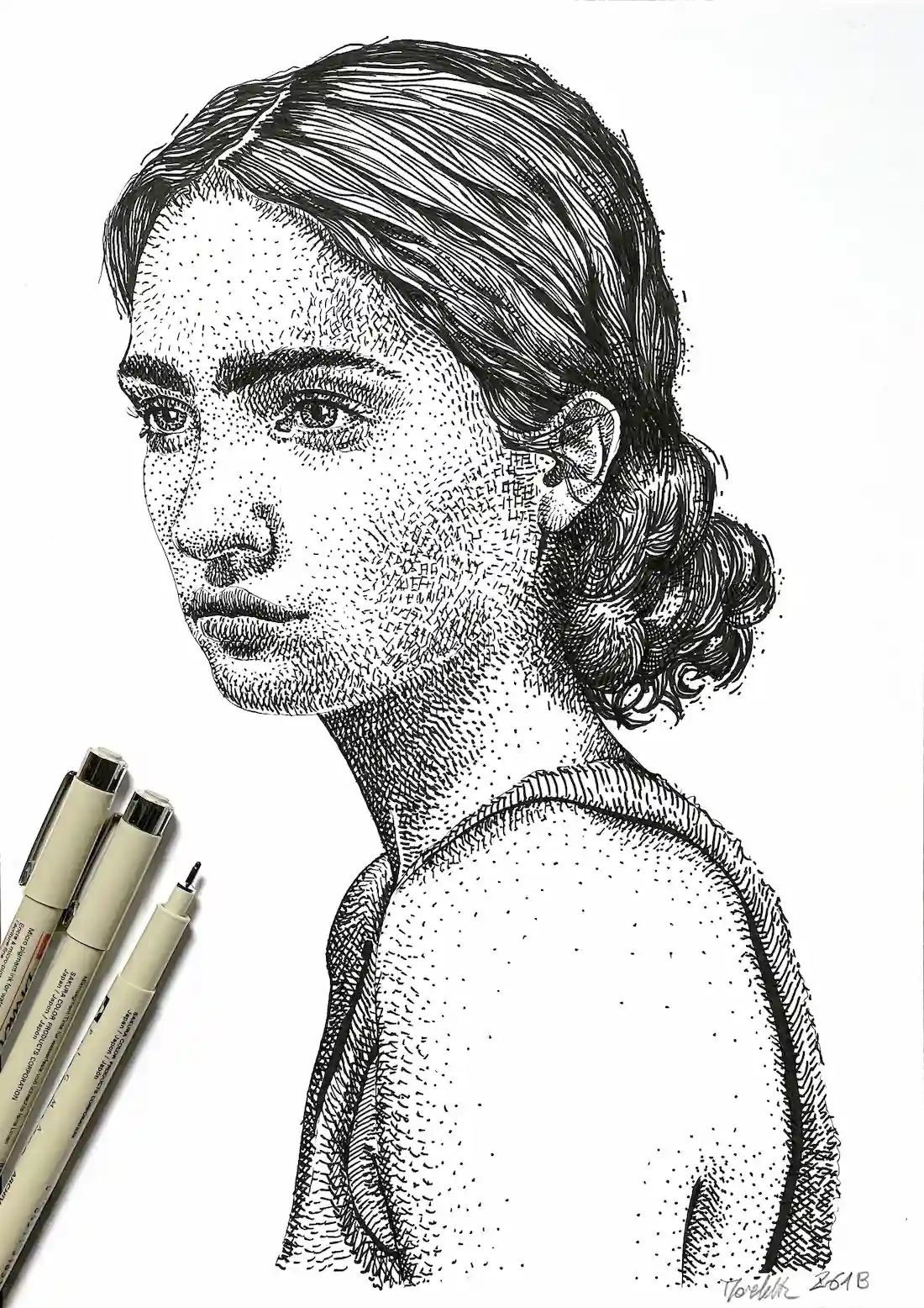 The hair pulls back into a low chignon. Dense parallel strokes render it with a weight that contrasts with the looser, more dispersed marks across the skin.