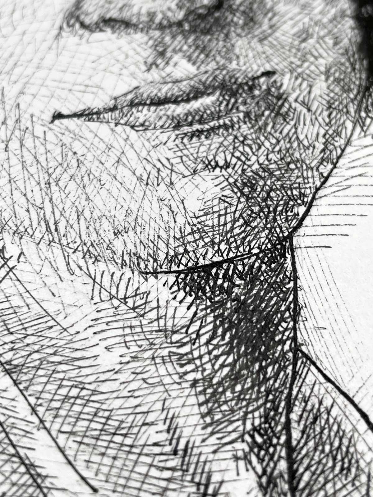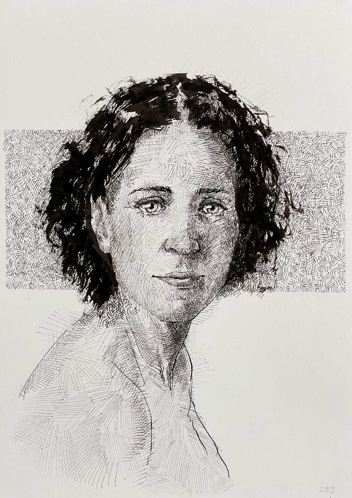 This contemporary ink portrait on paper shows the expressive potential of ink. The medium is both precise and spontaneous. Moreover, contrast and light emerge with clarity in every stroke. The absence of color enhances depth and intensity. As a result, the portrait feels timeless and authentic. It highlights individuality, yet it resonates universally with viewers.