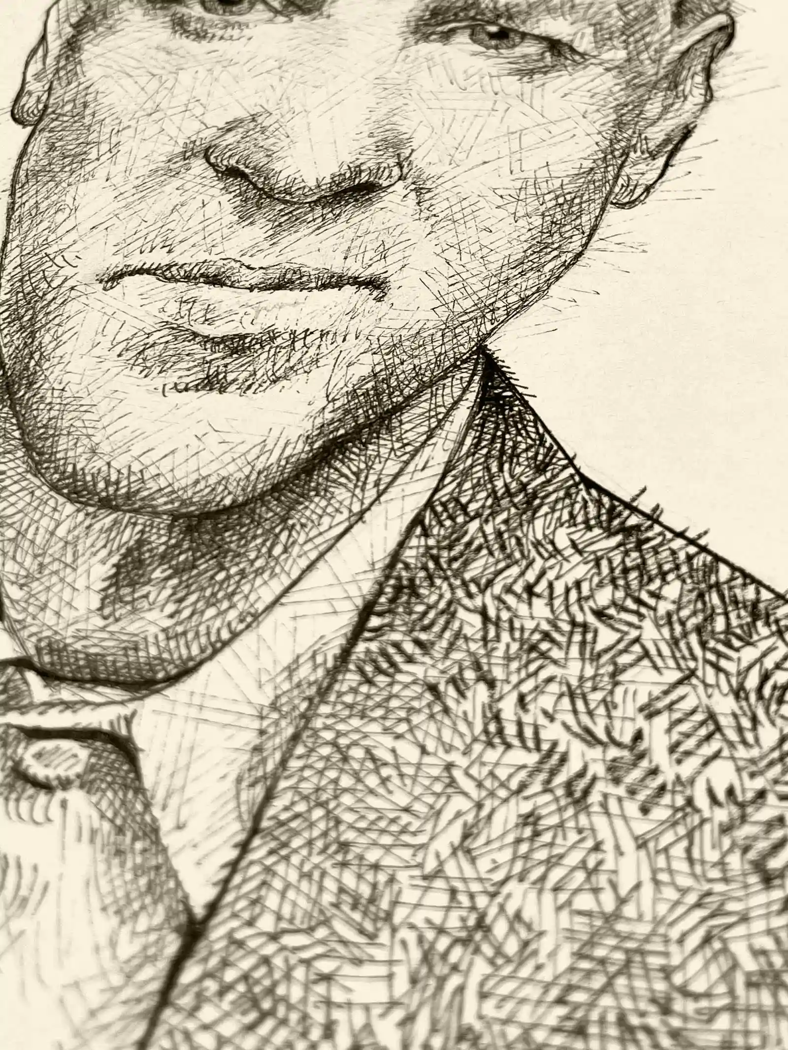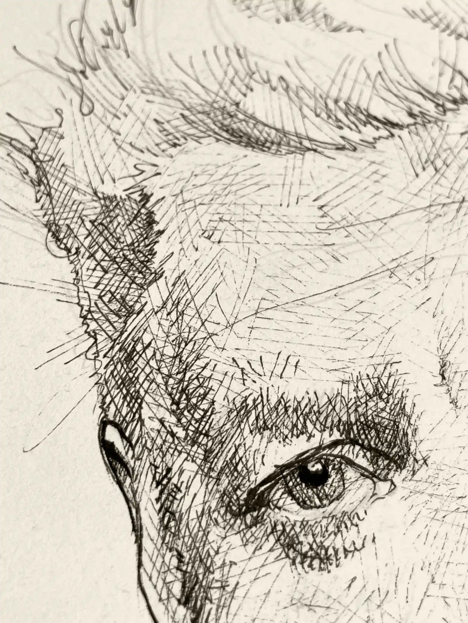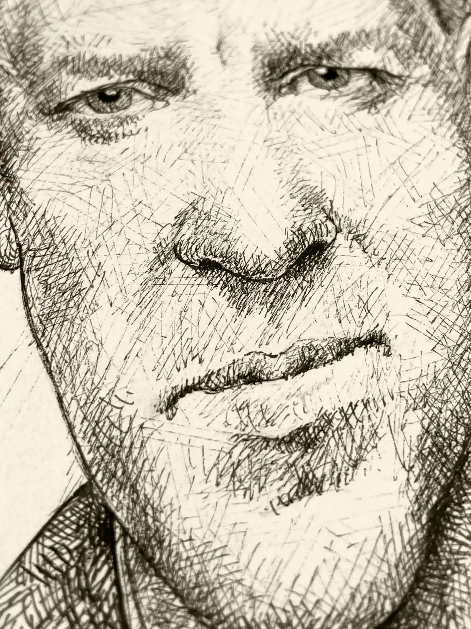 Rather than pursuing photographic realism, this ink portrait artwork emphasizes rhythm, anatomy and mental character.