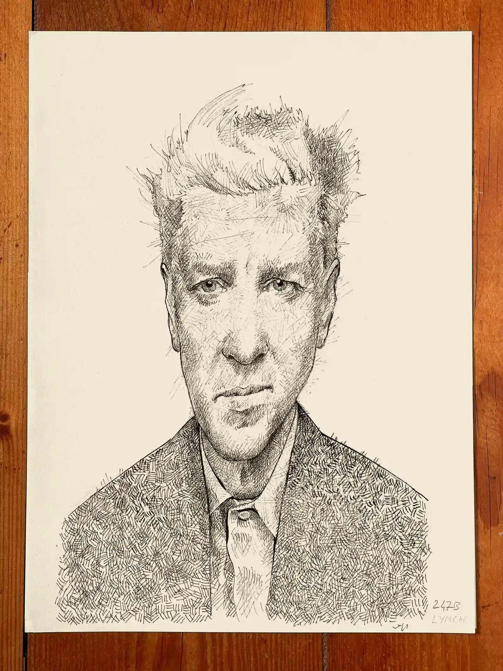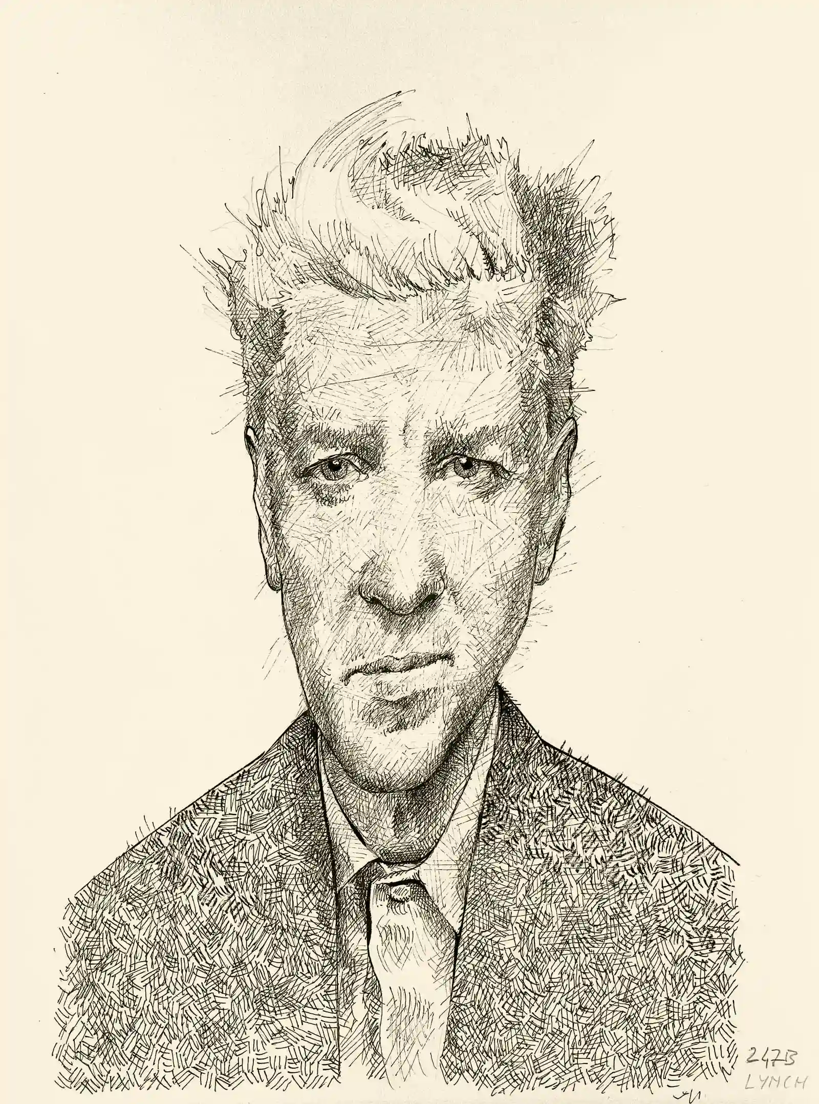 The portrait depicts David Lynch with a frontal gaze, focusing on psychological intensity and structural precision.