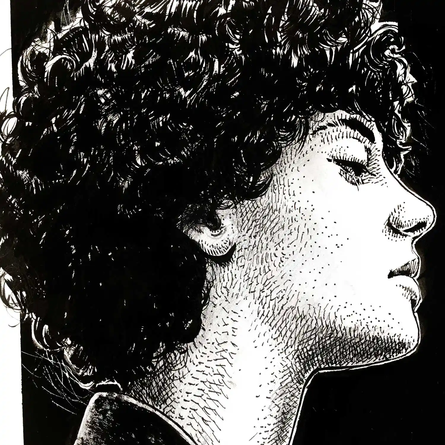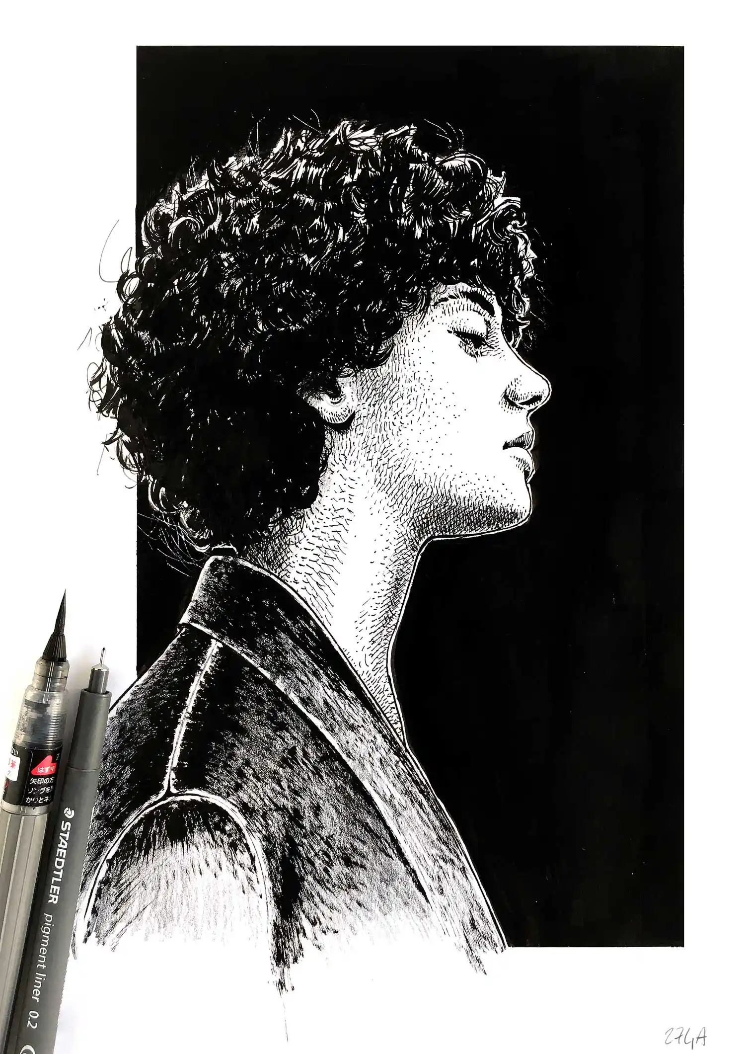 Through fine hatching and layered line work, the portrait expresses texture and depth with controlled precision. Moreover, the use of high-contrast ink enhances the sculptural quality of the face, while the curled hair and subtle posture suggest intimacy and silent narrative.