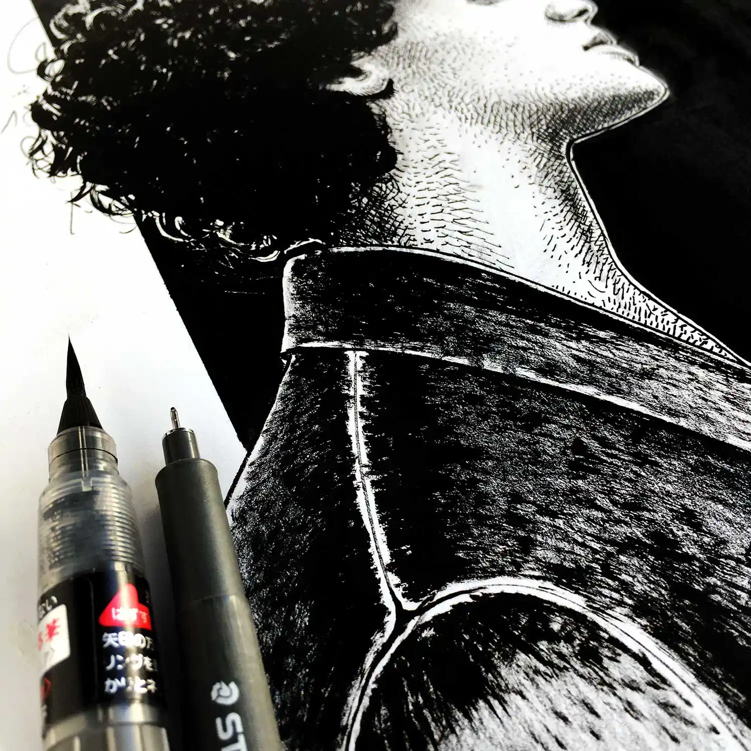 Executed entirely in black ink on 240g fine art paper, this work demonstrates meticulous attention to detail and surface control. Additionally, the paper’s texture allows crisp definition and nuanced tonal variation. The artwork is signed on the front and delivered unframed, accompanied by a certificate of authenticity.