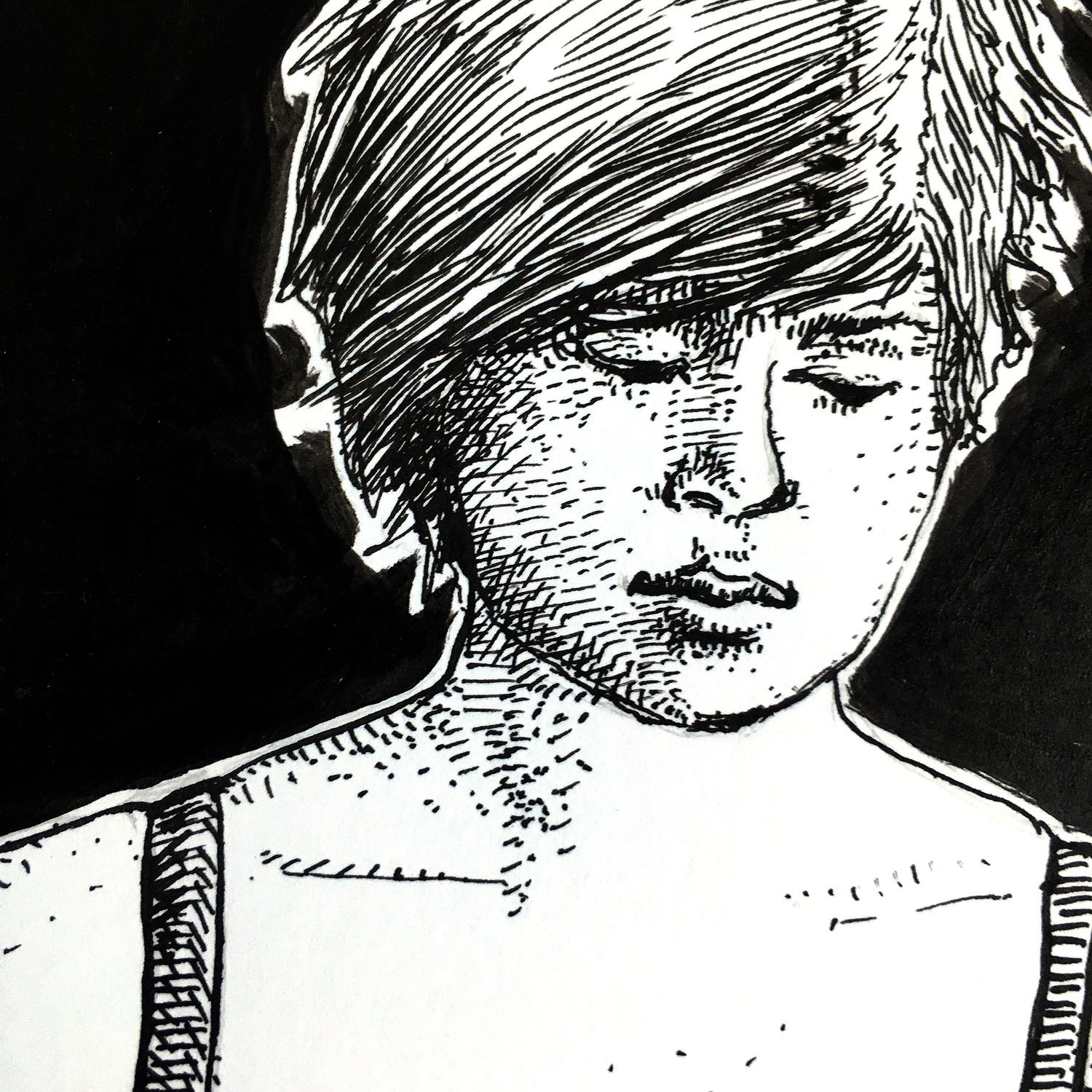 This female ink artwork on paper balances strength and vulnerability, inviting the viewer into a quiet, personal narrative. The minimalist black-and-white palette emphasizes contrast and emotion, typical of Moschetta’s figurative series dedicated to intimacy and the human presence.