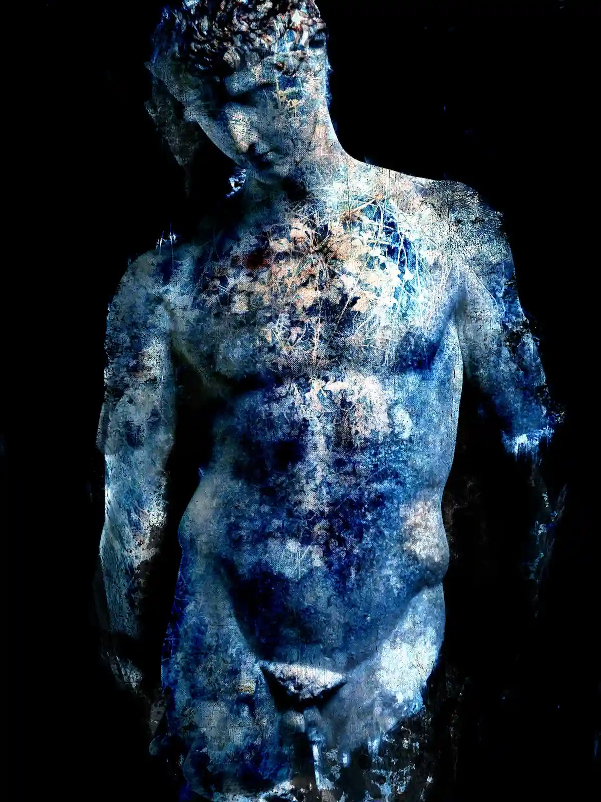 The male figure, rendered with sculptural presence, emerges from a deep black background while the textured surface — rich in blue tones, raw marks, and luminous fragments — adds tension and depth.