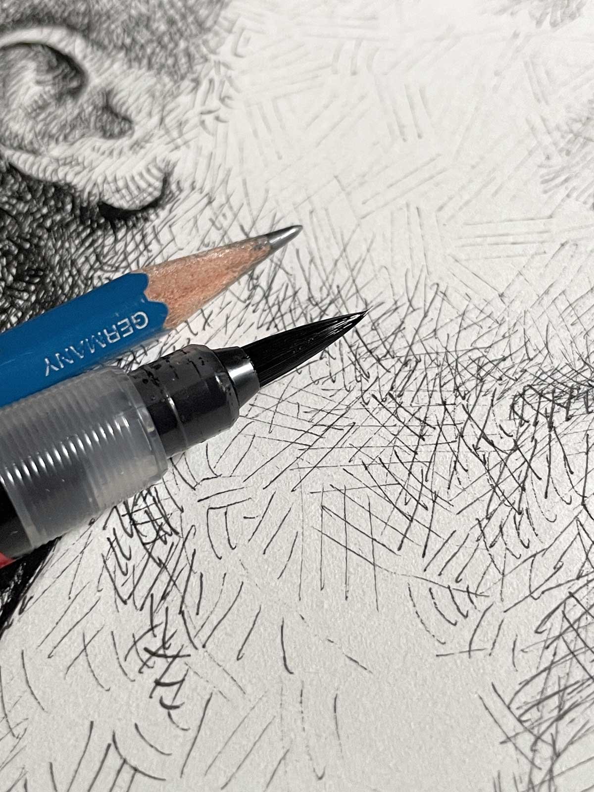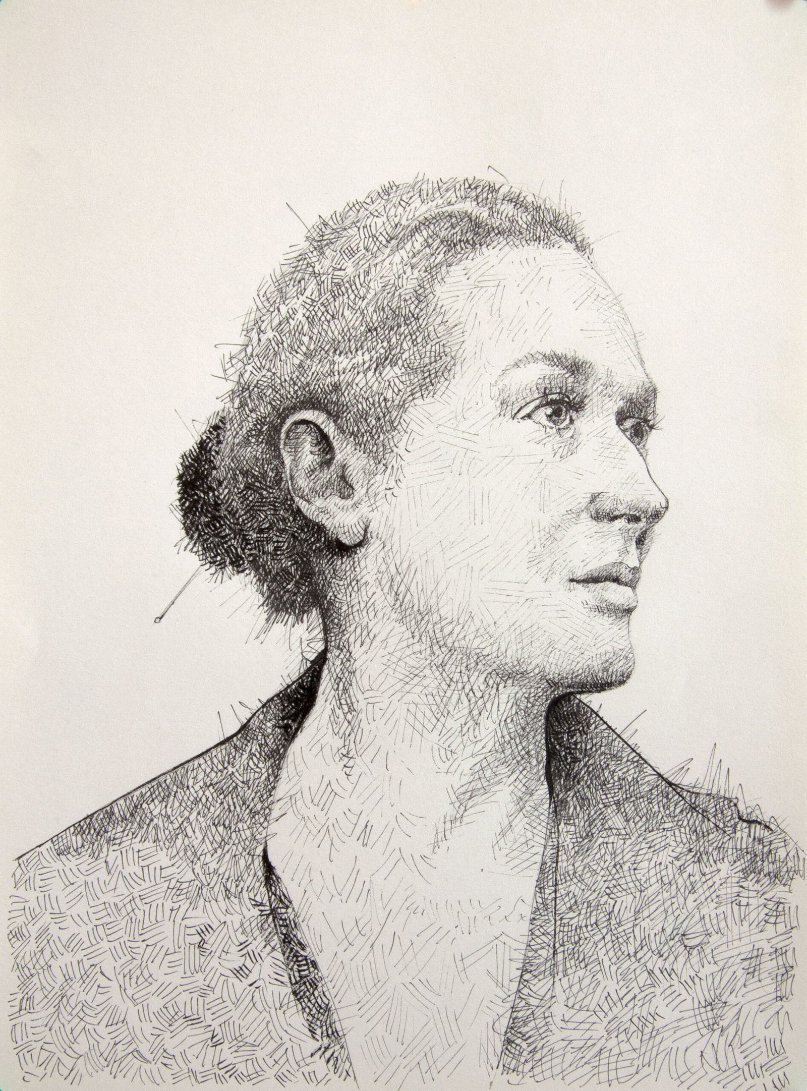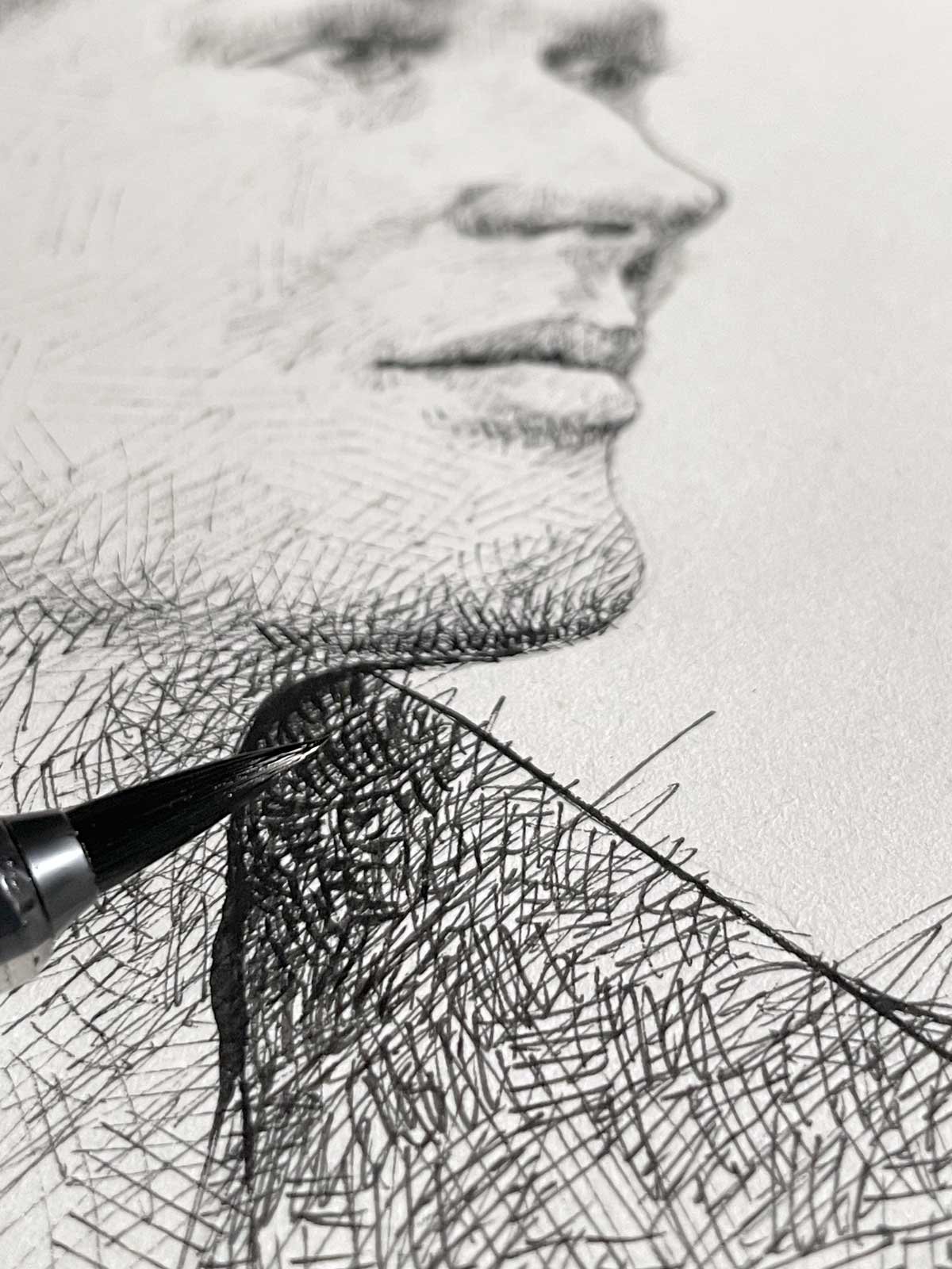 The drawing reveals a personal approach to portraiture, where every ink stroke contributes to a unique visual rhythm.