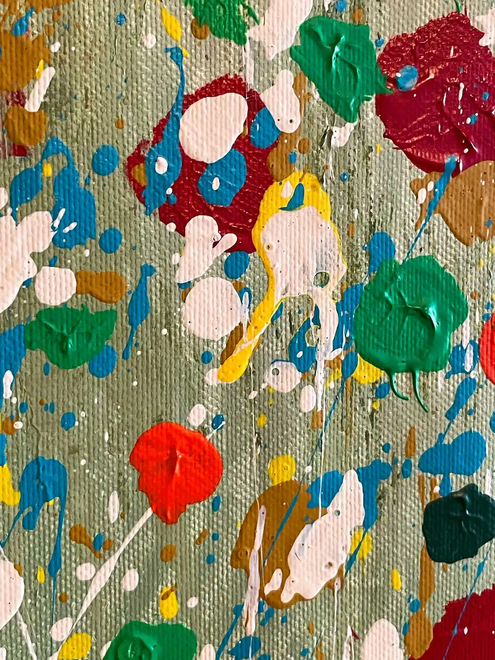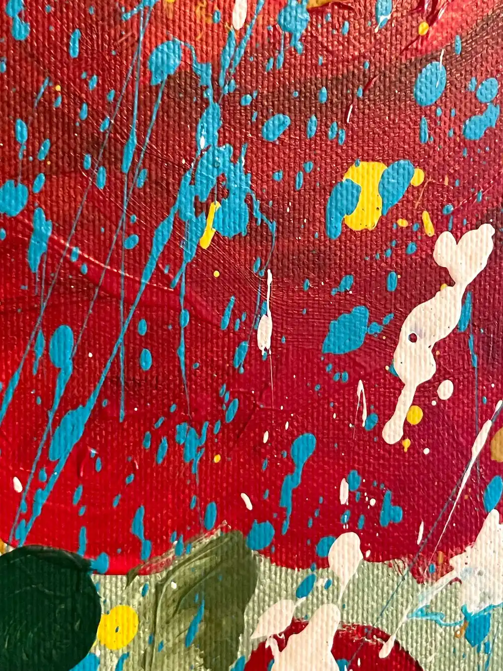 The large red forms act as visual anchors while the splashes of color create a sense of movement across the canvas.